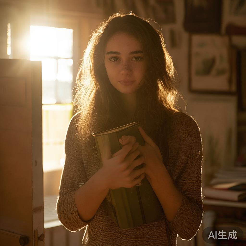 一股勇气如潮水般涌来,她站起身,整理好书籍,捧着母亲留下的梦想,与即将到来的挑战击掌相应。门缓缓打开,通往外部世界的一道光束照耀着她的脸庞。走出去的那一步,不仅是踏出家门,更是迈向一个全新的开始。